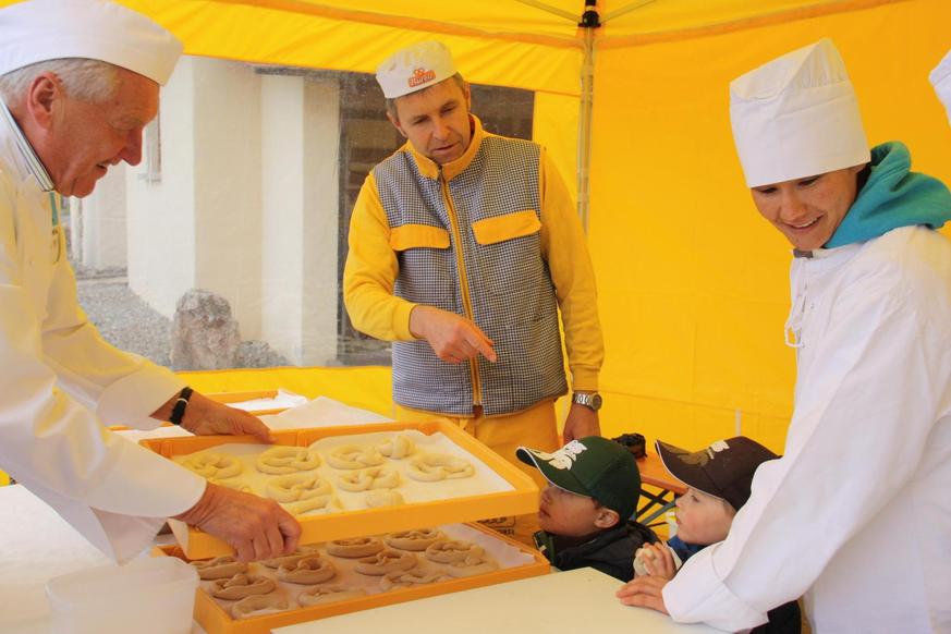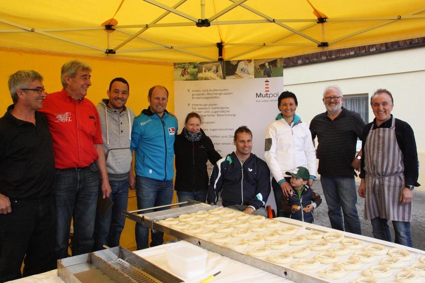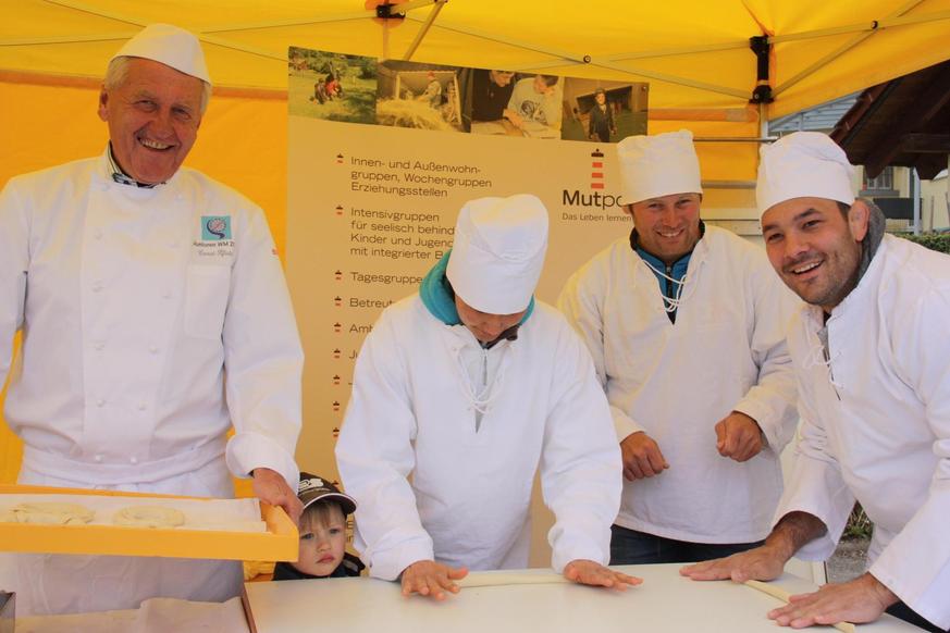 Unter dem Motto „Sportler backen für Mutpol“ haben am Samstag fünf bekannte Spitzensportler und Ex-Wirtschaftsminister Ernst Pfister zusammen mit dem „Freundeskreis Dreifaltigkeitsberg“ im Backhaus auf dem Dreifaltigkeitsberg Holzofenbrot und Brezeln gebacken.