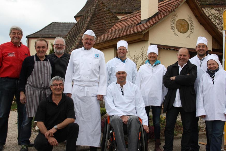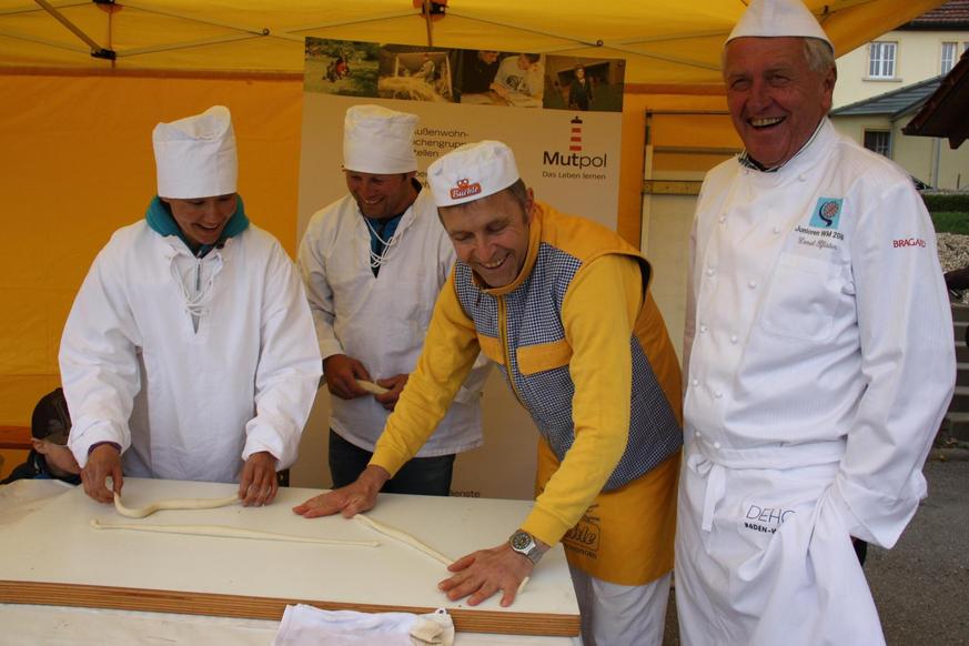 Die Rhönrad-Meisterin Kathrin Schad, die 2013 mit Erfolg bei den Olympischen Spielen in Chicago dabei war, sowie ein weiterer erfolgreicher Olympia-Teilnehmer, der Ringer Marc Buschle, und Frank "Litty" Ettwein, Ex-Spitzenhandballer beim HBW Balingen-Weilstetten, sind schon da und langweilen sich ein bisschen, weil sie noch nicht gebraucht werden. Als die Ex-Biathletin und zweifache Olympia-Medaillengewinnerin von Vancouver, Simone Hauswald, und der frisch gebackene Deutsche Meister im Rollstuhl-Tischtennis, Marcus Sieger, erscheinen, ist das Sportler-Quintett komplett. Die ersten Brezeln müssen in die Lauge und gesalzen werden. Dann hat Ernst Pfister seinen Auftritt im weißen Outfit eines Fünf-Sterne-Kochs.