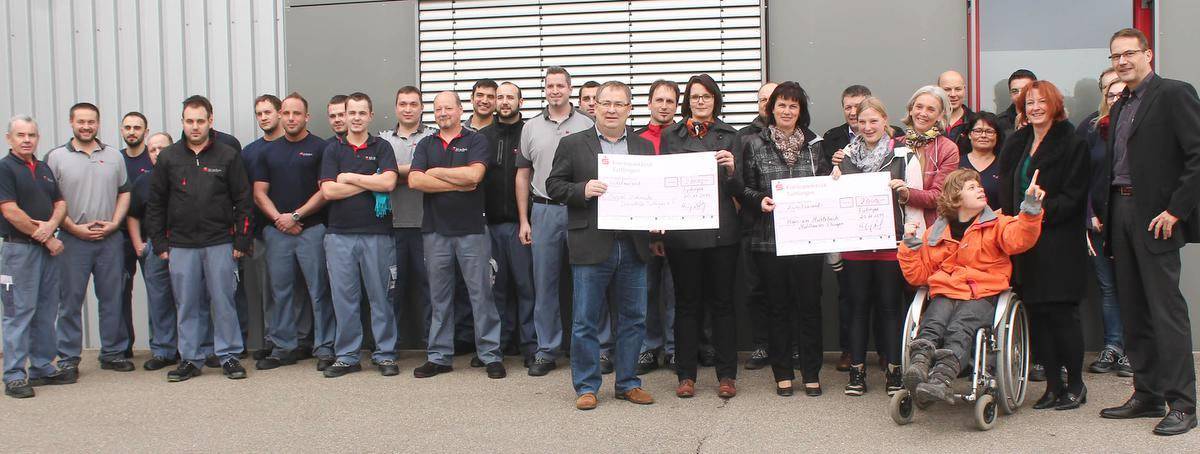 LIPTINGEN / TUTTLINGEN – Die Liptinger Firmen RS-Technik CAD-Cam GmbH und Schafhäutle Präzisionstechnik haben keine Weihnachtspräsente an Geschäftsfreunde verschickt und stattdessen zwei gemeinnützigen Einrichtungen eine Spende überreicht. So erhielten Roland Klamert (vorn links), stellvertretender Gesamtleiter der diakonischen Jugendhilfe Mutpol in Tuttlingen, und Christiane Kirch-Jacobi (9. von rechts) und Hilke Hantel vom "Haus am Mühlenbach" in Mühlhausen-Ehingen je einen Scheck über 2.000 Euro. "Am Herzen liegen uns regionale Einrichtungen im Bereich der Kinder und Jugendbetreuung, die häufig nicht die Wahrnehmung in der Öffentlichkeit genießen wie große karitative Einrichtungen, aber Großes in der regionalen gemeinnützigen Tätigkeit leisten", sagten der geschäftsführende Gesellschafter Roland Schafhäutle und Christa Schafthäutle – in der Hoffnung, im Namen der Geschäftsfreunde zu handeln. "Unsere Firmenphilosophie ist, unseren Mitarbeitern ein verlässliches Arbeitsumfeld und so die Basis für ein stabiles familiäres Umfeld zu schaffen. Diesen Leitgedanken möchten wir in die Öffentlichkeit tragen und unsere gesellschaftliche Verantwortung als Unternehmen wahrnehmen. Mit dieser Spende wollen wir denjenigen eine Unterstützung bieten, die durch unterschiedliche Vorkommnisse benachteiligt sind", fügte RS-Technik-Geschäftsführer Henning Baldauf (rechts) an. Bei der Spende an das "Haus Mühlebach" für die Hilfsaktion Brandopfer "Bauwagen Gallmannsweil" handelt es sich um eine nicht separat bezifferte zusätzliche Spende für den Helferkreis der betroffenen Familien. (hoho) Foto: Hoho