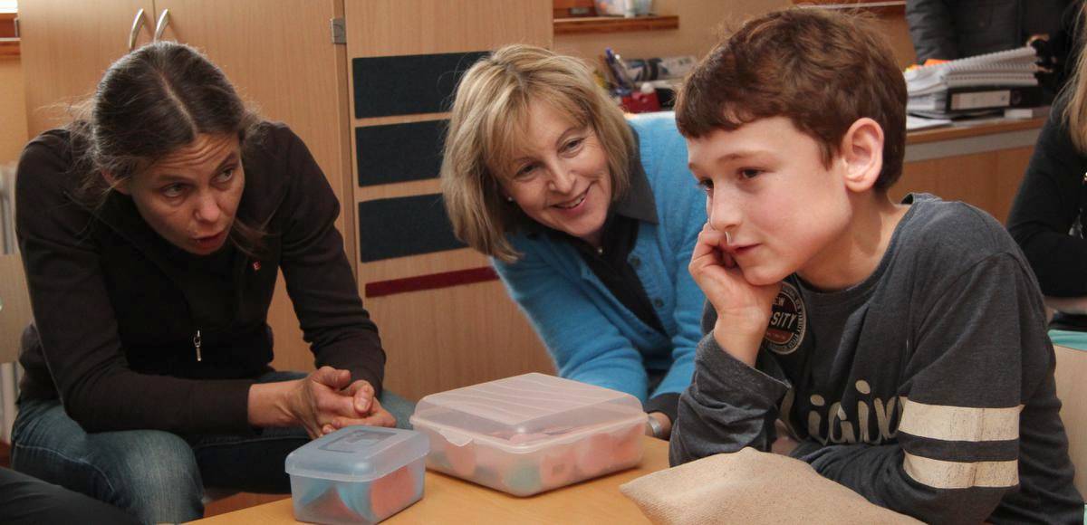 Lehrerin Katja Winterle (links) und Marion von Wartenberg hören zu, was ein autistischer Junge über seinen Tag erzählt. Foto: Mark Hänsgen