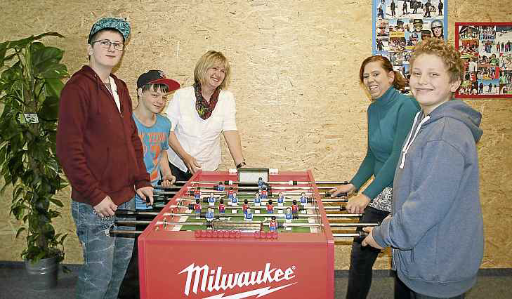 Lehrerin Eva Kirsch (Dritte von links) und Katja Schmid, die die Stelle der Sozialarbeiterin ausfüllt, spielen mit ein paar Schülern Tisch-Kicker.