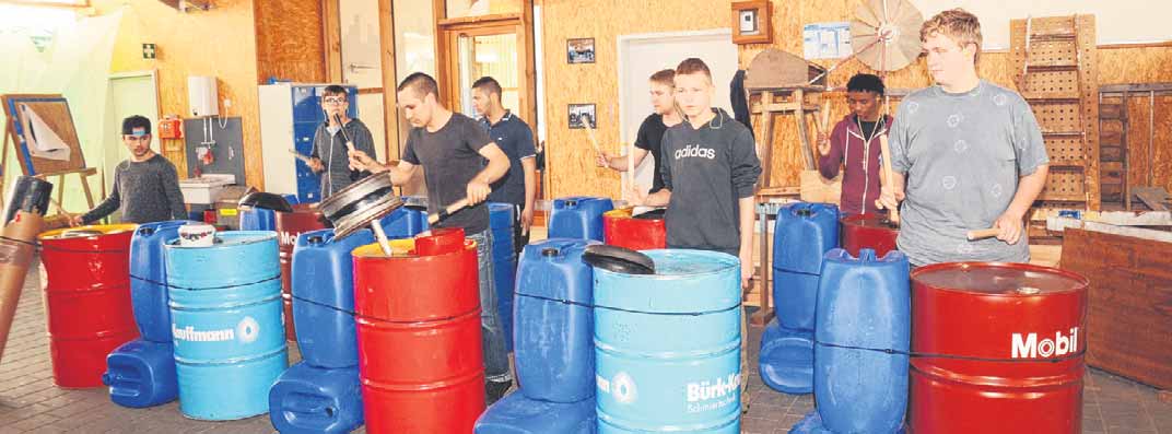 Die Beatstomper-Gruppe in der Projektwerkstatt des Mutpol. Es wird rhythmisch – und es wird laut.