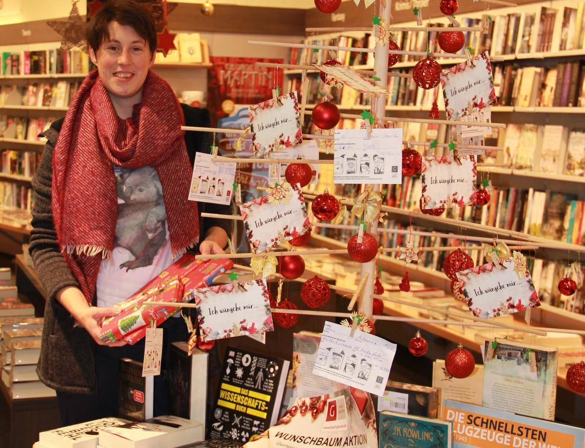 Im Vorfeld wurden dazu Karten an die Kinder und Jugendlichen verteilt, die darauf ihre Bücherwünsche notieren konnten. "Die Kids haben fleißig mitgemacht, wir haben rund 30 Karten bekommen", berichtet die Buchhändlerin. Die hängen nun an einem Holz-Weihnachtsbaum, der gleich im Eingangsbereich der Buchhandlung steht. Die passenden Bücher zu den Wünschen liegen direkt unter dem Baum auf einem Tisch. "Kunden, die einen Wunsch erfüllen möchten, können sich dann eine Karte nehmen, das Buch an der Kasse bezahlen und wir packen es hübsch ein und übergeben die Pakete dann alle gesammelt vor Weihnachten", erklärt Katharina King.