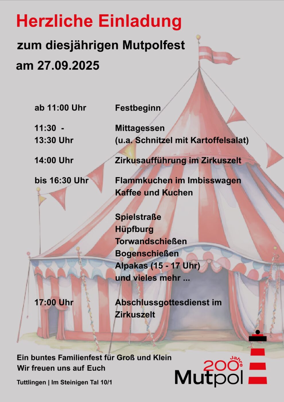Im Jahr 2025 begehen wir unser 200-jähriges Jubiläum. Neben vielfältigen Veranstaltungen sollen Ihnen der nachstehende Film und unsere neue Jubiläumsbroschüre Eindrücke von unserer Geschichte und unseren aktuellen Aufgabengebieten geben. Am 27.09.2025 findet unser großes Mutpolfest statt, zu dem wir sehr herzlich einladen. Neben vielen Angeboten für Kinder und Jugendliche haben unsere Kinder ein tolles Zirkusprogramm einstudiert. Weitere Infos können Sie der Tagespresse oder unserem Festflyer entnehmen.